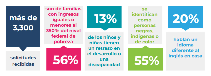 Durante el periodo principal de solicitudes esta primavera, recibimos más de 3,300 solicitudes para el programa Preescolar Para Todos (PFA por sus siglas en inglés). Los datos muestran que seguimos llegando a nuestras poblaciones prioritarias: