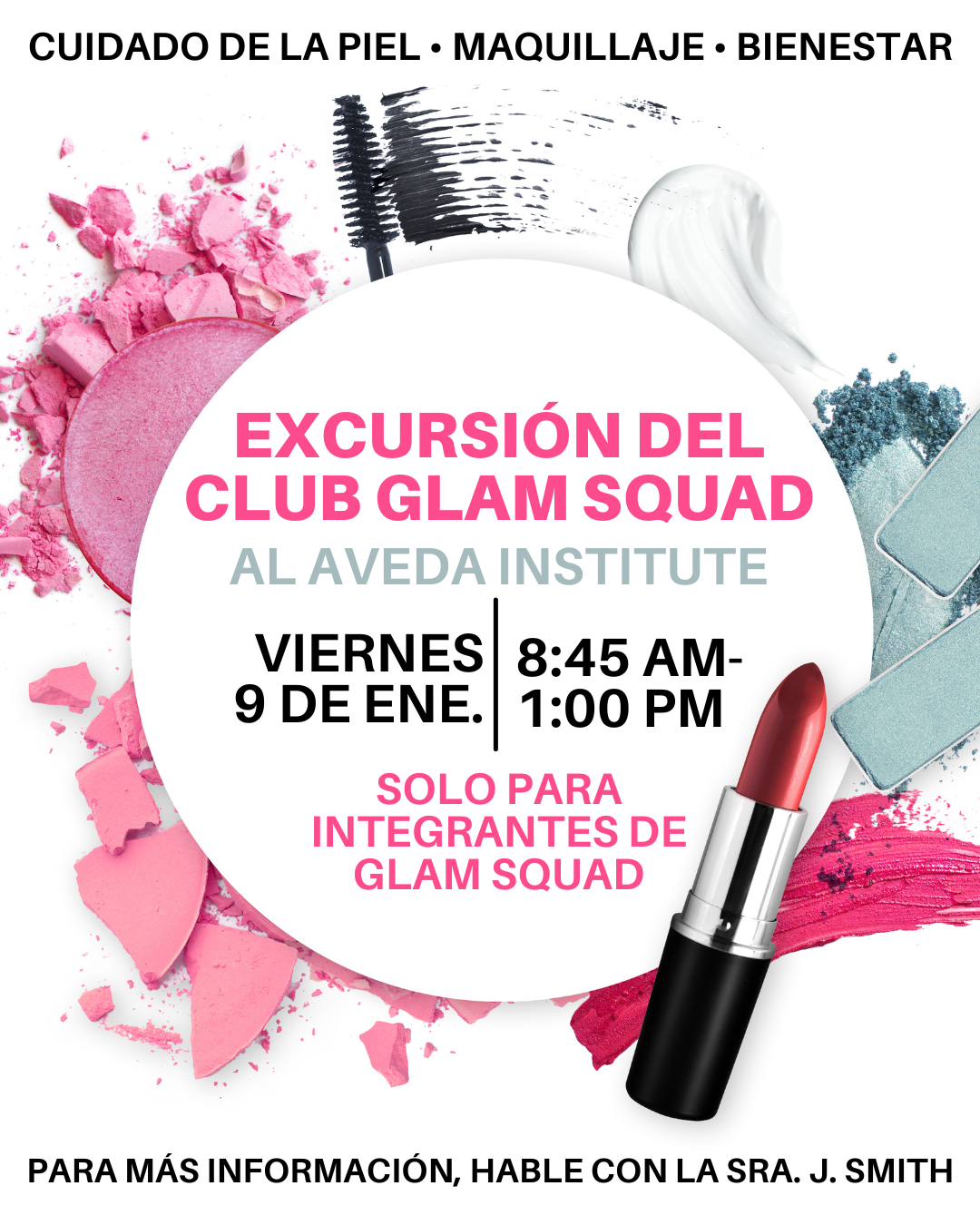 El Club Glam Squad realizará una excursión especial el viernes 9 de enero, de 8:45 AM a 1:00 PM, al Aveda Institute, una escuela de cosmetología donde los estudiantes participarán en una sesión práctica gratuita para aprender sobre cuidado de la piel y aplicación de maquillaje. Durante la visita, las y los integrantes de Glam Squad recibirán un servicio facial profesional y aprenderán sobre tipos de piel, rutinas saludables de cuidado y técnicas adecuadas de maquillaje. Esta experiencia está diseñada para ayudarles a ampliar su comprensión de la belleza, el bienestar y el autocuidado. Solo asistirán los integrantes de Glam Squad.