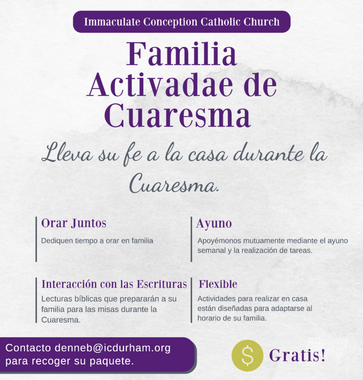 Por preocupación sincera por su seguridad, les pido que tengan mucha precaución. Por favor, no se arriesguen a venir a la Iglesia si las condiciones no son seguras. Su bienestar —y la seguridad de los demás en la carretera— es lo más importante.