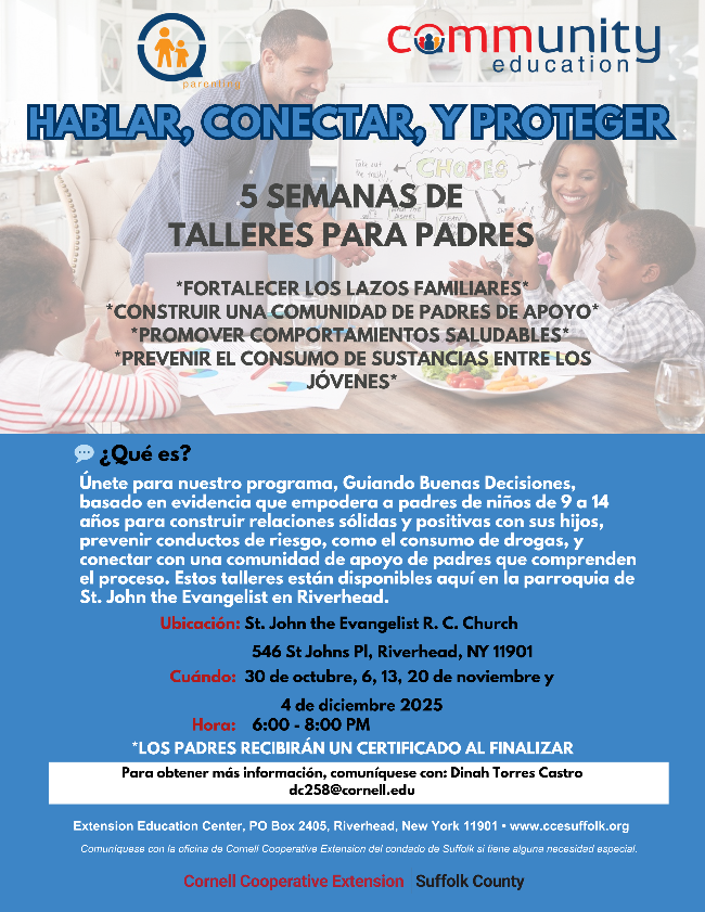 Tu donación a Cornell Cooperative Extension del Condado de Suffolk nos ayuda a ofrecer programas esenciales que educan, empoderan y fortalecen a nuestra comunidad. Desde talleres de nutrición y bienestar hasta educación para jóvenes, agricultura sostenible y programas ambientales, tu apoyo garantiza que estos servicios estén disponibles para todos.