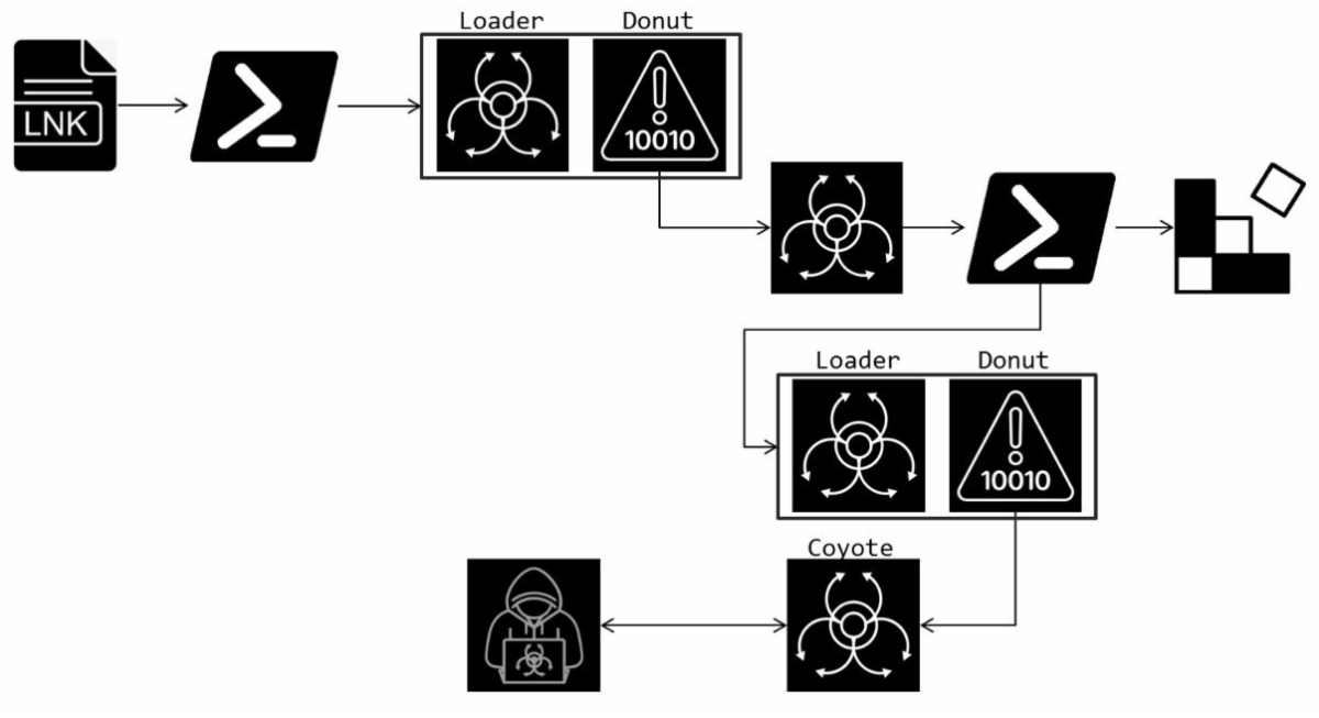 En el último mes, FortiGuard Labs ha identificado una serie de ataques cibernéticos que utilizan archivos LNK como vector inicial de infección. Estos archivos contienen comandos PowerShell diseñados para ejecutar scripts maliciosos y conectarse a servidores remotos con el fin de desplegar el troyano bancario Coyote. Este malware tiene como objetivo principal a usuarios en Brasil y busca robar credenciales de más de 70 aplicaciones financieras y numerosos sitios web. A continuación, se detalla el funcionamiento de cada fase de la operación maliciosa. | |