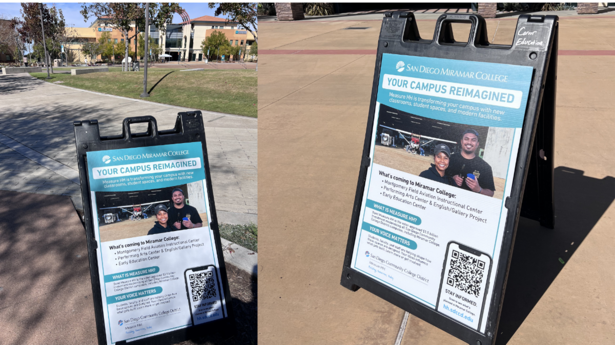 New A-frame information displays have been placed at key locations at San Diego City, Mesa, and Miramar colleges, as well as the College of Continuing Education, to make it easier for campus communities to access Measure HH updates.