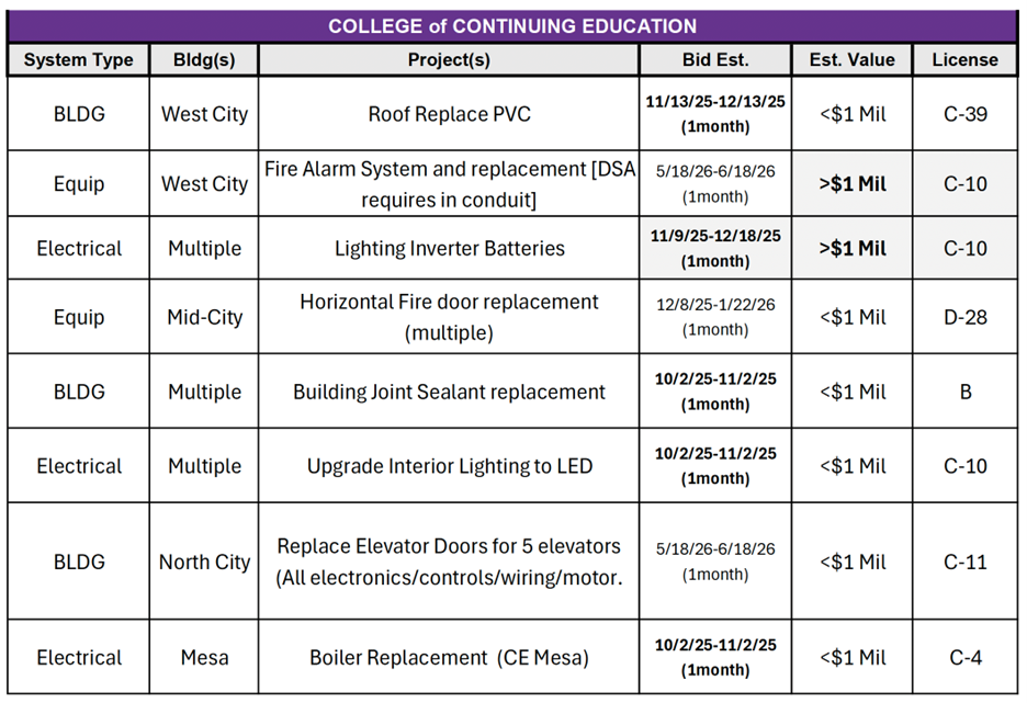 Cumming partners closely with the San Diego Community College District to help develop project programs, budgets, schedules, and management procedures that keep Measure HH on track. Their work ensures that every project, from minor infrastructure upgrades to full building modernizations, moves efficiently from planning to completion, with complete alignment to campus operational goals. Whether it’s new lighting, HVAC systems, garage door replacements, chilling systems, lighting or roof repairs, the Cumming Group has a long list of projects to oversee.