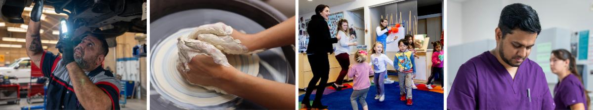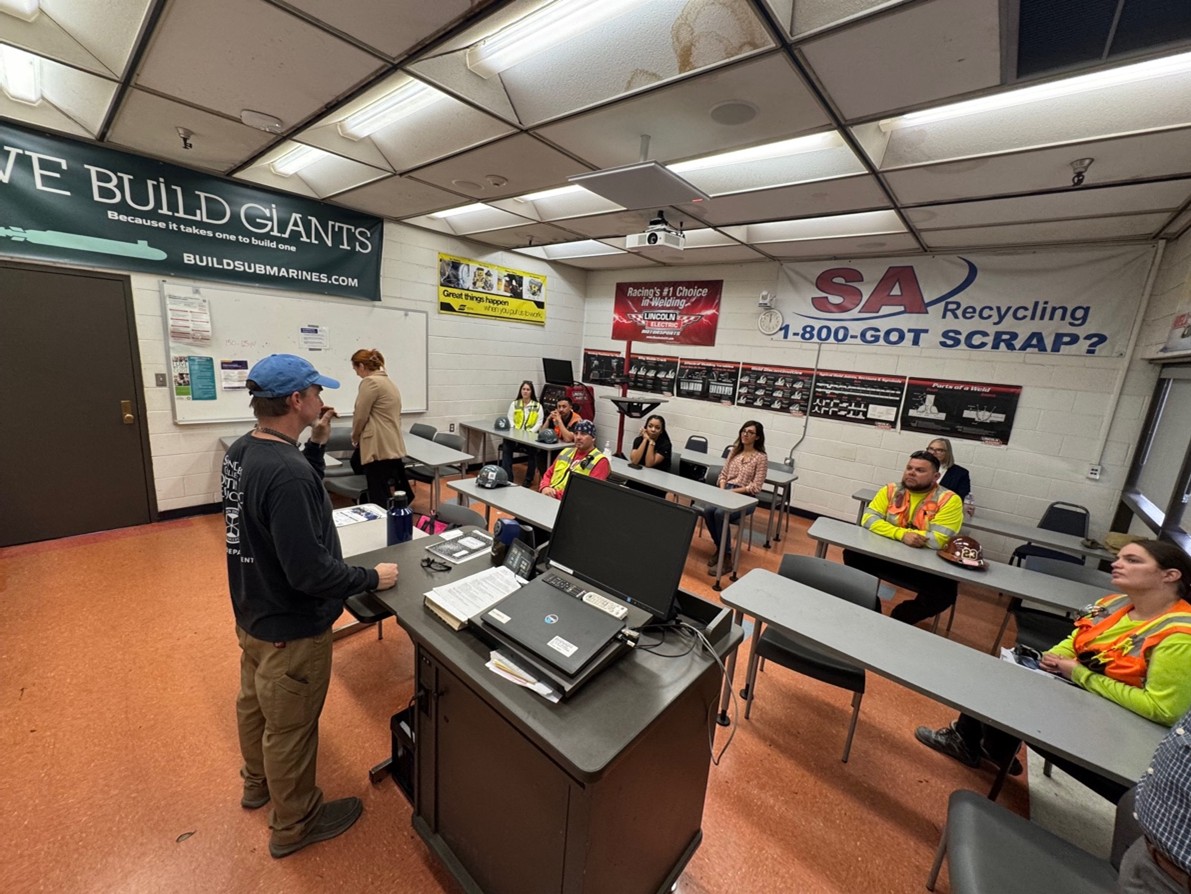 Top photo: As part of a Workforce Education lunch and learn, contractors on the Educational Cultural Complex (ECC) Theatre Renovation tour the welding facility at the Skills Center, hearing from the instructor Mike Bradbury, an ECC alumnus, about career opportunities in the welding industry.