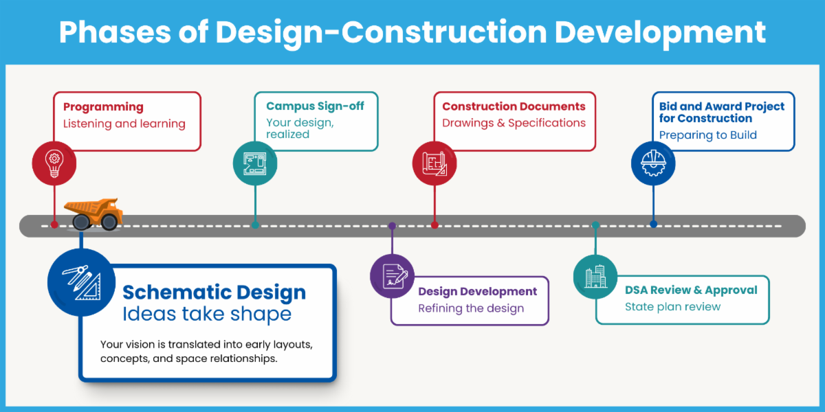 Designing a campus is a step-by-step process. Some phases focus on listening and understanding needs, while others translate those ideas into drawings, plans, and eventually construction. The outline below explains what happens at each stage and where projects are today.