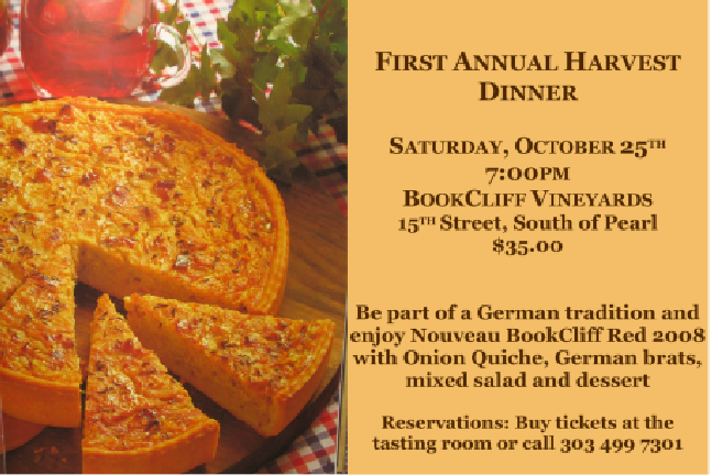 AN EVENING WITH WINE AND FOOD AT BOOKCLIFF VINEYARDS Have you been curious about the winemaker dinners at Bookcliff Vineyards, but you are not sure whether a five course dinner is for you? Check it out and join us for an evening with wine and food - a three course dinner. We invite you to the winery to meet the chef and winemaker and enjoy a casual dinner in the winery surrounded by barrels. Our chef in March is Matt Collier, who sources all the ingredients from local farmers and ranchers in Boulder County.