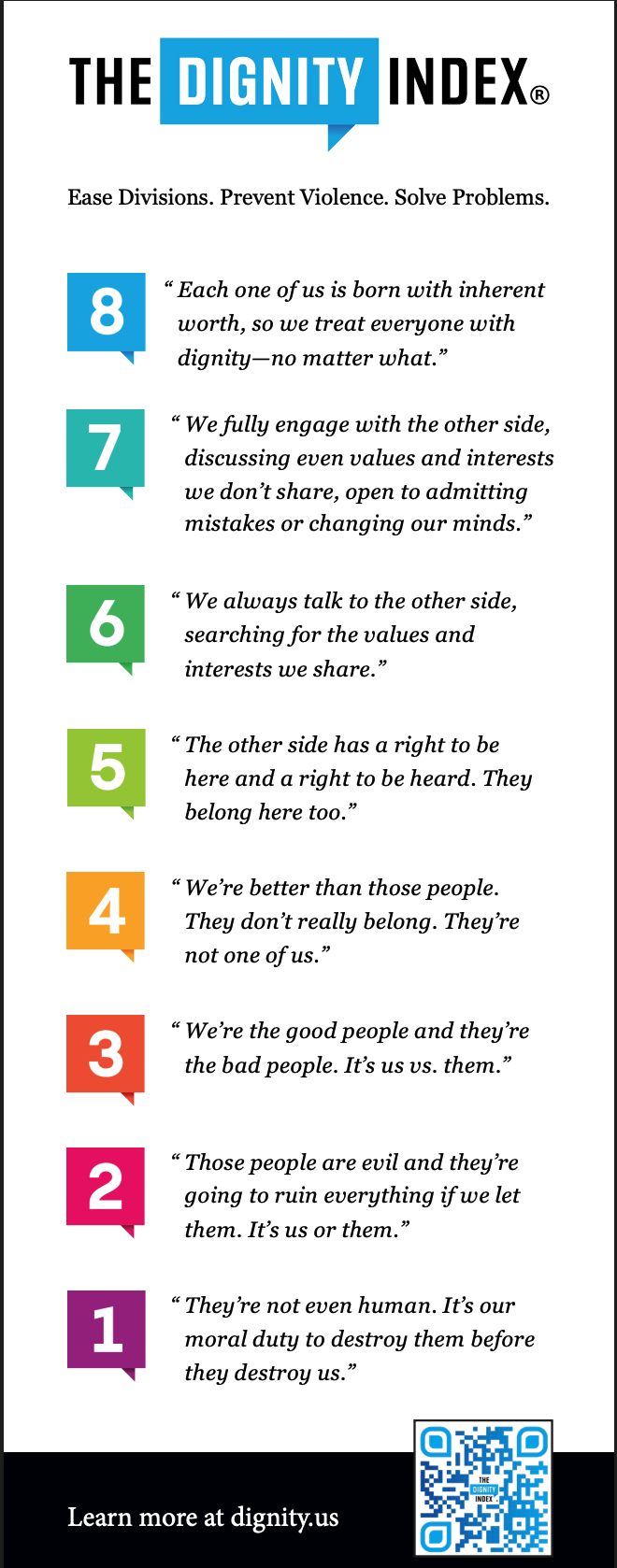 According to the site, The Dignity Index is “an 8-point scale that measures what we do when we disagree. Each scale point represents a particular mindset toward the other side, ranging from #1 – which sees no dignity at all in the other side – to #8, which sees the dignity in everyone, no matter what.” Rather than being a scorecard, although it looks like one, it is meant to be a reflective tool: when we pay attention to dignity and contempt, we are apt to employ more dignity and less contempt.