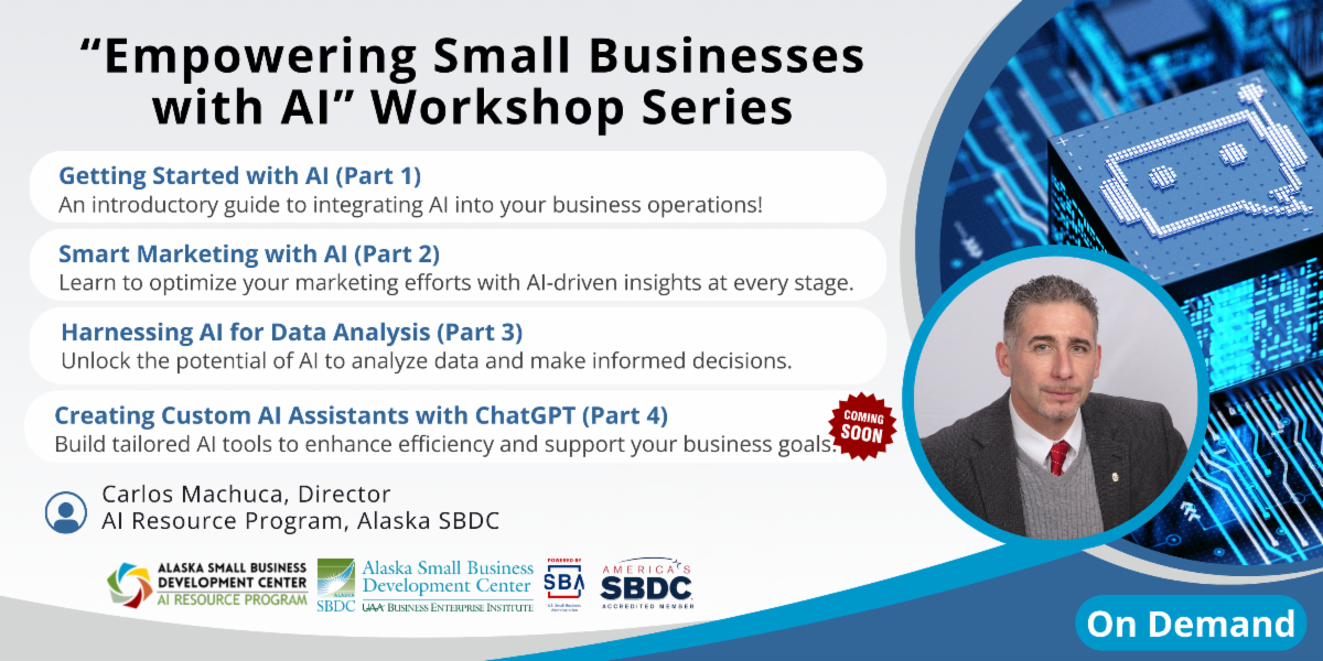 Unlock the potential of AI to elevate your business with the Empowering Small Businesses with AI Workshop Series! Produced by the AI Resource Program at Alaska SBDC, this series offers small business owners practical tools and actionable strategies for integrating AI into everyday operations.