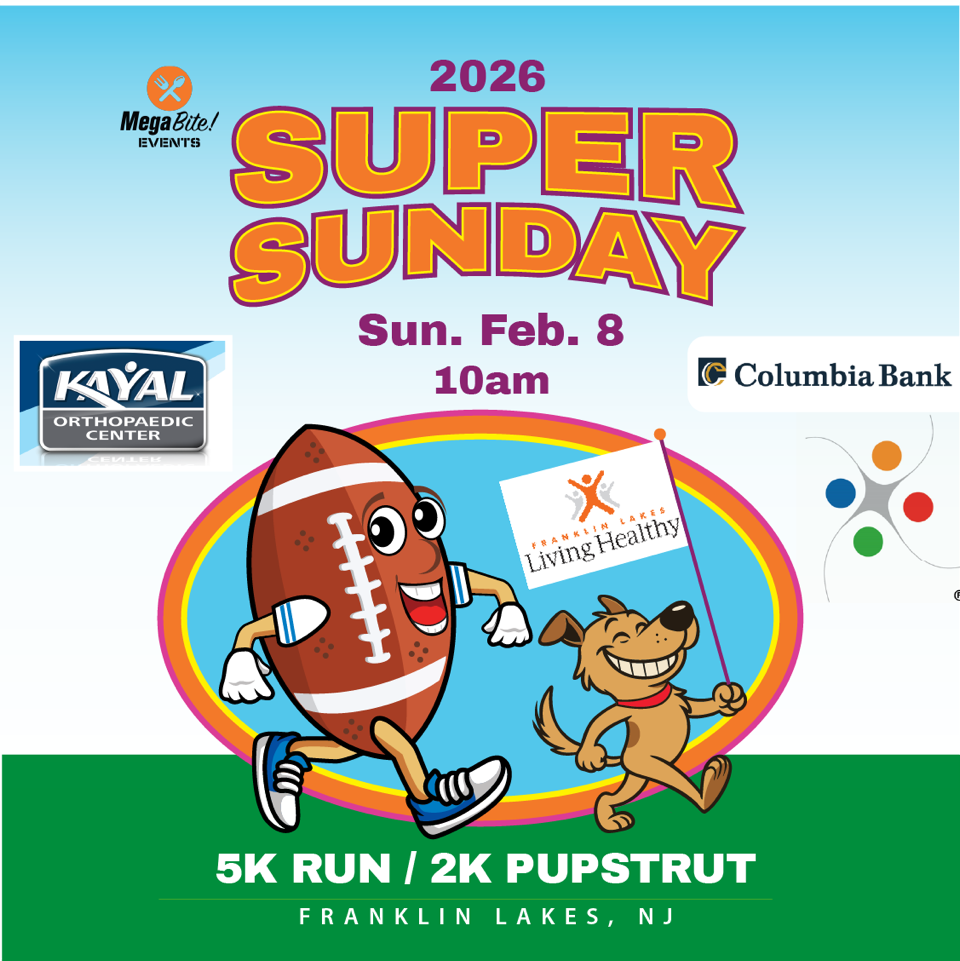 Join us for the first annual Franklin Lakes Living Healthy “Super Sunday” 5K & 2K Pup Strut on Super Bowl Sunday, February 8th at 10:00 AM! Kick off the day with a fun and energetic run or walk before the big game — whether you're racing the 5K or enjoying a relaxed 2K with your pup, it’s the perfect way to make room for all that football Sunday food. All are welcome to run, walk, volunteer, or cheer on friends and family. Enjoy music from Phantom DJ, post-race food courtesy of 101 Pub. The first 250 registered runners will receive a commemorative T-shirt and medal, so be sure to sign up early. Don’t miss this exciting community event — let’s start Super Bowl Sunday strong!