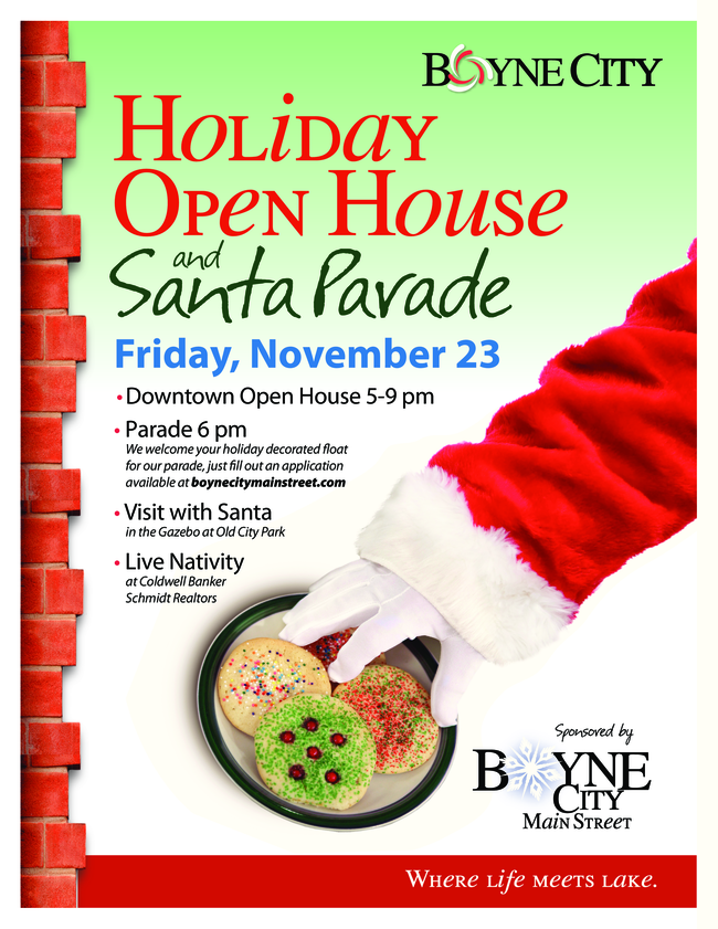 The Boyne City Holiday Open House and Santa Parade is a true community celebration of the season on Nov. 23, the Friday after Thanksgiving, from 5 to 9 p.m. The open house begins at 5 p.m. with refreshments at businesses throughout the downtown, and the parade starts at 6 p.m. Boyne Area Girl Scouts will light the Community Christmas Tree in Old City Park at 5 p.m. Following the tree lighting the Girl Scouts will lead holiday revelers in caroling. Santa will arrive on his horse-drawn sleigh in the parade, joined by some of his elves and reindeer from the North Pole. Those participating in the parade must send in a parade registration form and line up on East Main Street between East and Park Streets starting at 5:30 p.m. The parade route will follow Lake Street to Water Street through the heart of downtown. After the parade, children can visit with Santa at the Gazebo in Old City Park. For more information, contact For more information contact Boyne City Main Street at 231-582-9009. Parade poster.