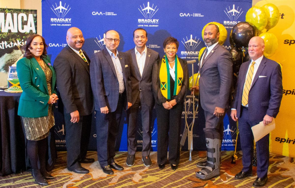 (Pictured left to right) Jamaica Tourist Board District Sales Manager Victoria Harper, Caribbean Trade Council President Andrew Lawrence, Spirit Airlines Senior Director of Airports Atul Kumria, former State Treasurer Shawn Wooden, Jamaica's Ambassador to the US Audrey Marks, State Representative Bobby Gibson, and CT Airport Authority Executive Director Kevin Dillon | |