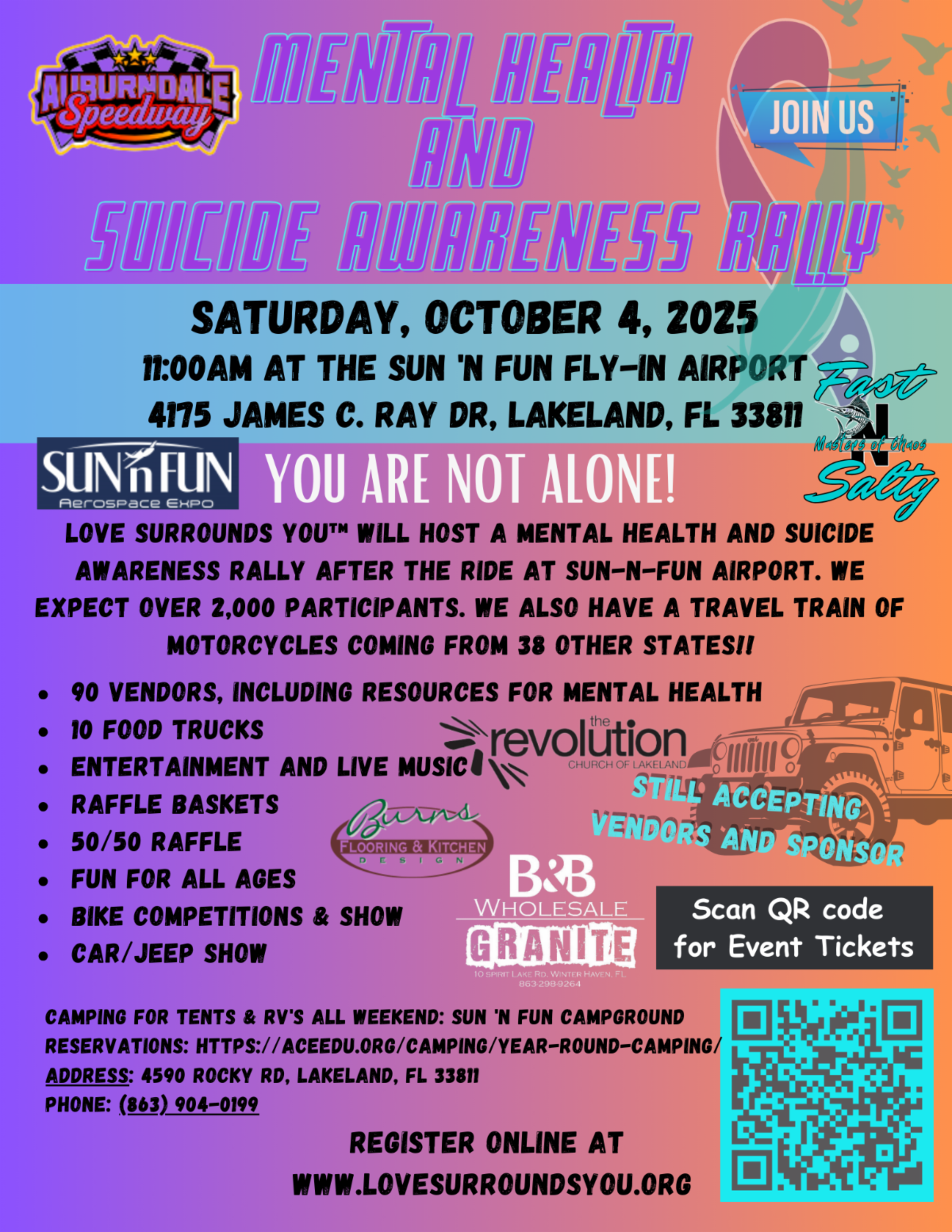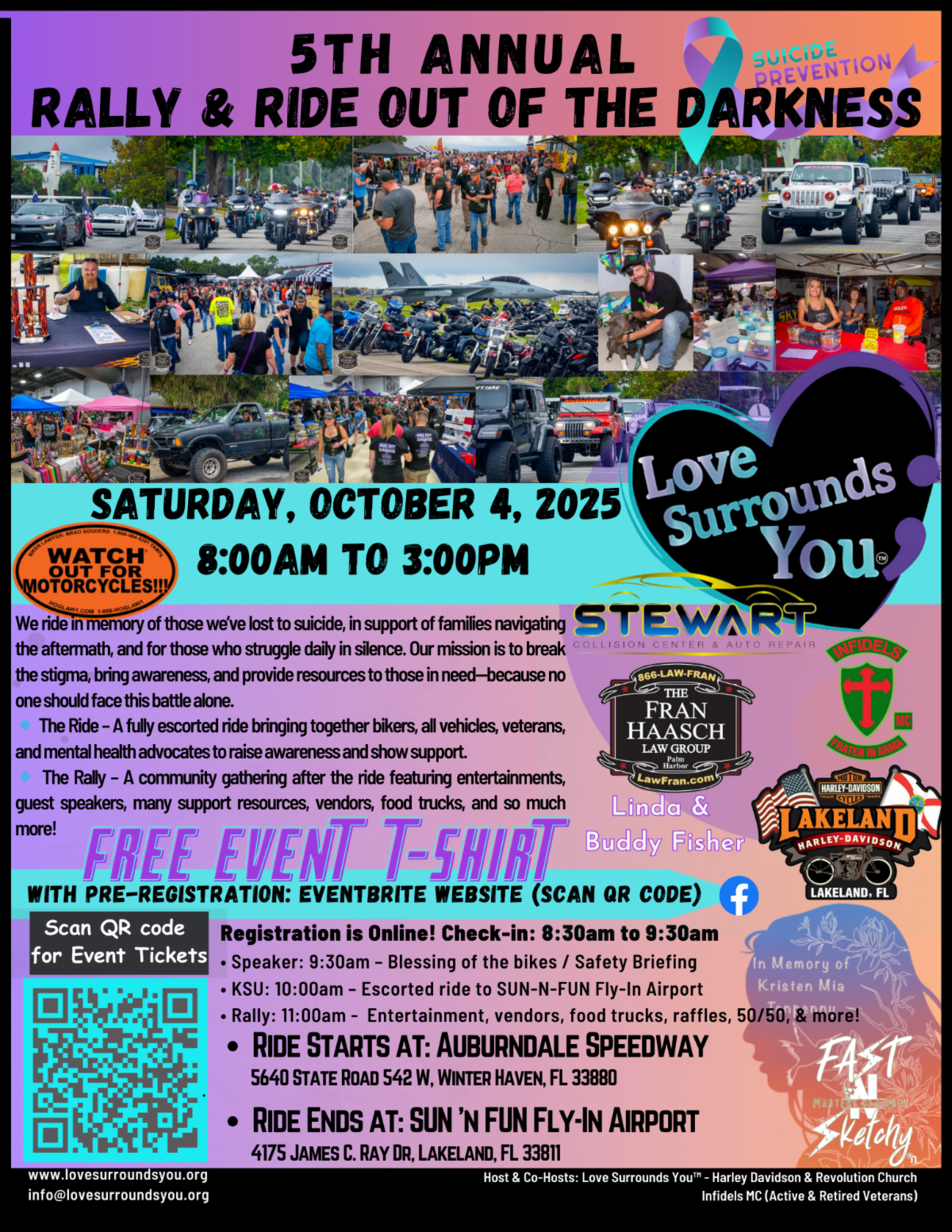 | | | Tessera of Brandon - Hybrid Dementia and Alzheimer's Support Groups | | | Volunteer Opportunity for Health Care Professionals - Benv Health Ministry Center & Research | | | | | | Oct. 3 - Black, White, & Bling Evening of Hope | | | Killer Mans Sons Motorcycle Club - Travis Brunelle Memorial Scholarship | | | Oct. 4 - Elks Motorcycle Club Event - Gun Raffle | | | Oct. 4 - Mental Health and Suicide Awareness Rally | | | Oct. 4 - 5th Annual Rally & Ride Out of the Darkness | | | Oct. 7 - Riverview Woman's Club Coffee Chat | | | | | Oct. 12 - Industry Appreciation Night at Xscape Theatres | | | |