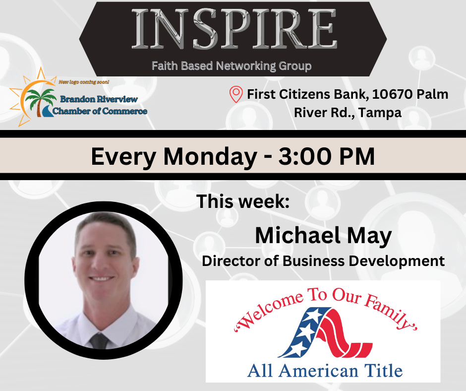 Join us Monday afternoons for the INSPIRE Networking Group. INSPIRE Networking Group's mission is to foster a vibrant faith-based business community where professionals come together to inspire, support, and uplift each other.