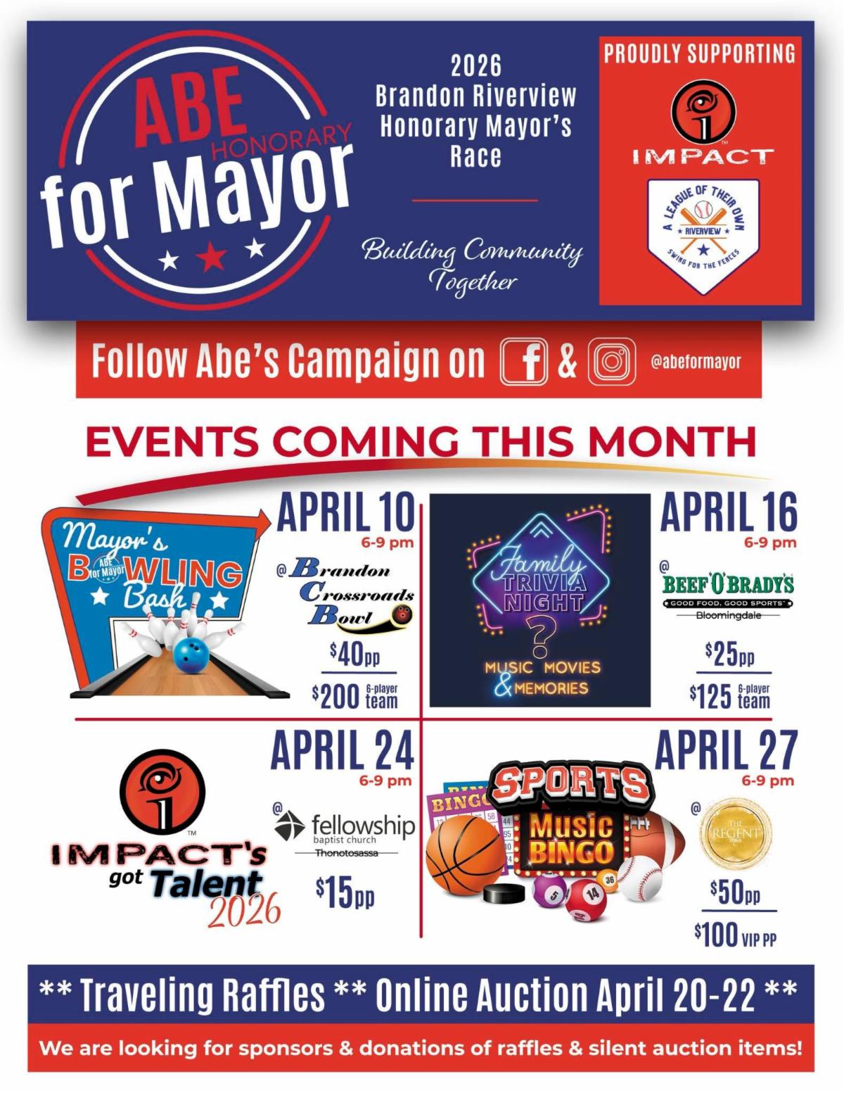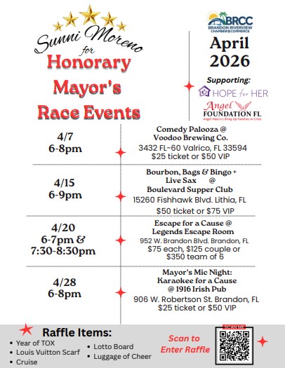 | | Brandon Rotary Club - Charity Fund Annual Scholarship Application - Deadline April 10 | The Rotary Club of Brandon has established the Brandon Rotary Club Charity Fund Annual Scholarship Fund for the benefit of students that live in or attend a high school in the Brandon Area. There will be multiple scholarships available. | | | Wednesdays in April - Ladies Night at Hand & Stone Bloomingdale | | | April 7 - Honorary Mayor's Race - Team Sunni - Comedy Palooza | | | April 7 - Hillsborough College Presidential Showcase | | | April 7 - Riverview Woman's Club Coffee Chat | | | April 8 - Riverview Woman's Club Monthly Luncheon | | | 2026 Pet Pageant - Entry Deadline April 10 | | | April 10 - Graze Craze 1 Year Anniversary! | | | |