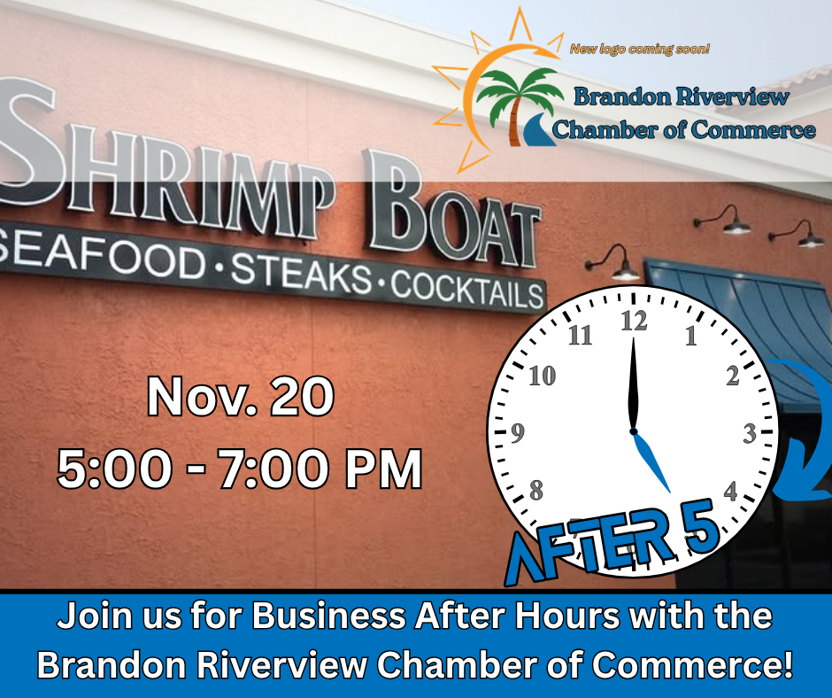 The Brandon Riverview Chamber of Commerce invites you to our Business After Hours at The Shrimp Boat Bar & Grill on Thursday, November 20th, from 5:00–7:00 PM.