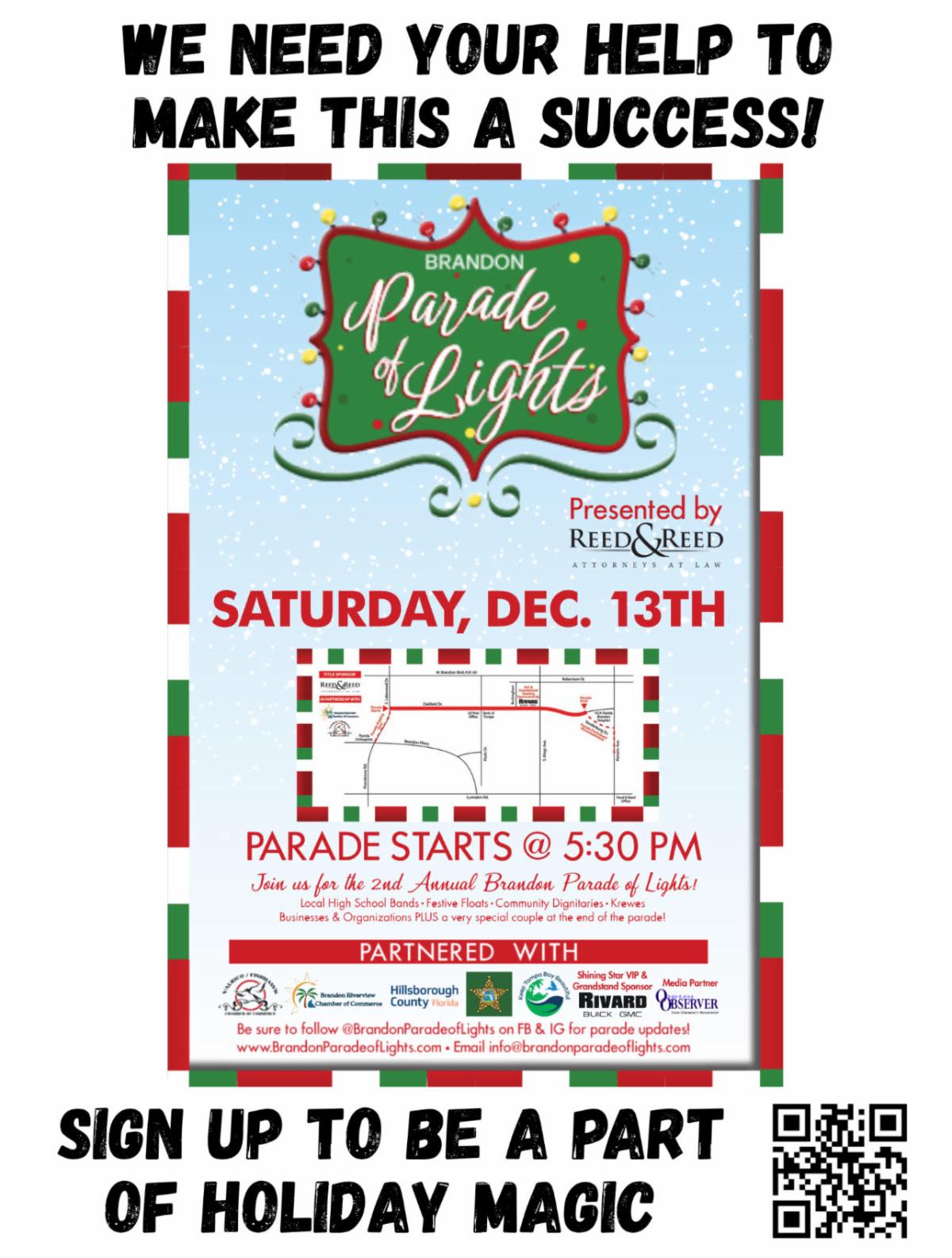 In partnership with Hillsborough Co., the Brandon Riverview Chamber of Commerce and Valrico/Fishhawk Chamber of Commerce are bringing our community together to share and celebrate holiday cheer. High school bands, businesses, non-profits, krewes and a special appearance at the end!