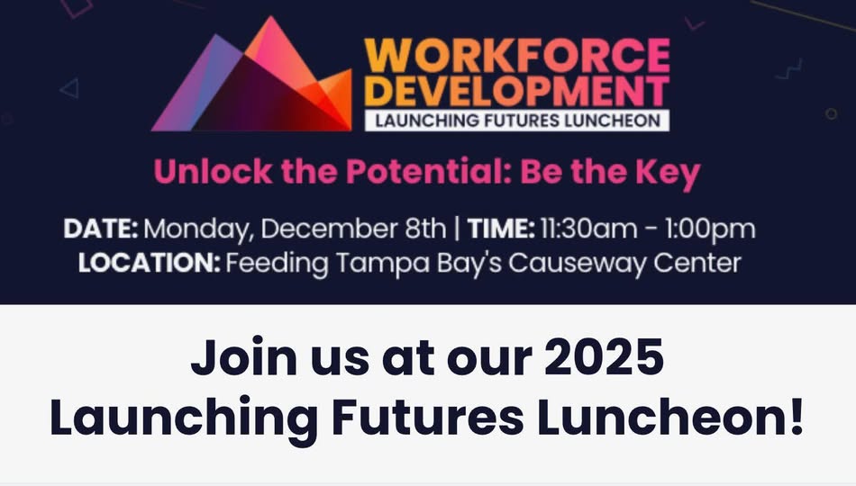 Workforce Development Partners, along with our community partners, is hosting the third annual Launching Futures Luncheon on December 8, 2025, at Feeding Tampa Bay. We hope that your business can join us for this special event as we celebrate our shared commitment to creating opportunities for Hillsborough County High School seniors through Launching Futures.