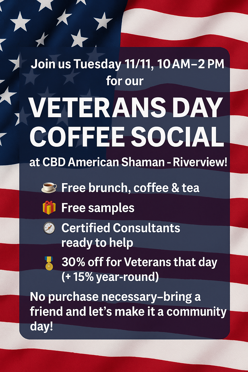 All guests will receive 30% off their entire purchase during the event, and we’re proud to honor a 15% year-round discount for all veterans and active-duty military members.