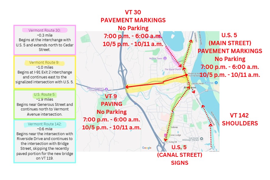 VT 142: The project begins at the Class 1 limit sign just south of the railroad tracks near Riverside Drive and follows VT 142 north to the intersection with U.S. 5 at the traffic signal, skipping over the newly paved portion of VT 142 completed for the Brattleboro-Hinsdale bridge project.