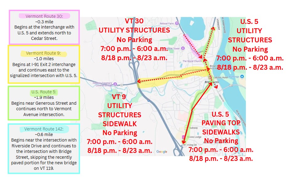 Nighttime single-lane closures will be in place next week on Monday night through Saturday morning from 7:00 p.m. to 6:00 a.m. Work will continue on Vermont Route 9 (Western Avenue and High Street), U.S. Route 5 (Canal Street and Main Street), and Vermont Route 30 (Linden Street). Flaggers will be present to direct one-way alternating traffic through multiple work zones. Motorcyclists should watch for grooved and uneven surfaces and all motorists should be aware of raised utility structures and wet paint.