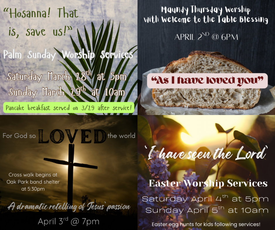 During our worship services on Easter we’ll collectively renew these baptismal promises that are at the heart of our faith. May this time leading up to Christ’s defeat of sin, death and hatred be a blessing to you, may it be a time of renewed rest, strength, and purpose. May you be reminded of God’s abundant and overflowing love for you.