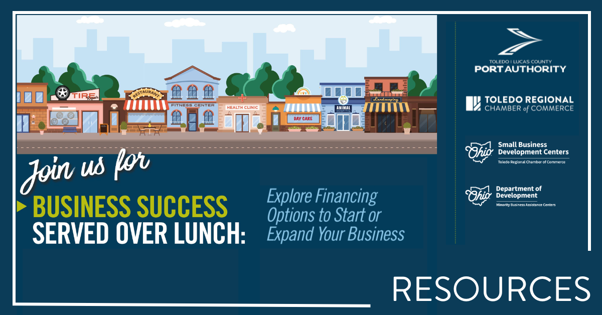 | | No-cost to attend, but registration is required. | | Join us for lunch, and to hear from the Toledo-Lucas County Port Authority’s financing team as well as representatives from the Small Business Development Center (SBDC) and the Minority Business Assistance Center (MBAC) on the various financing programs and services available to assist your new and/or growing business. | |
