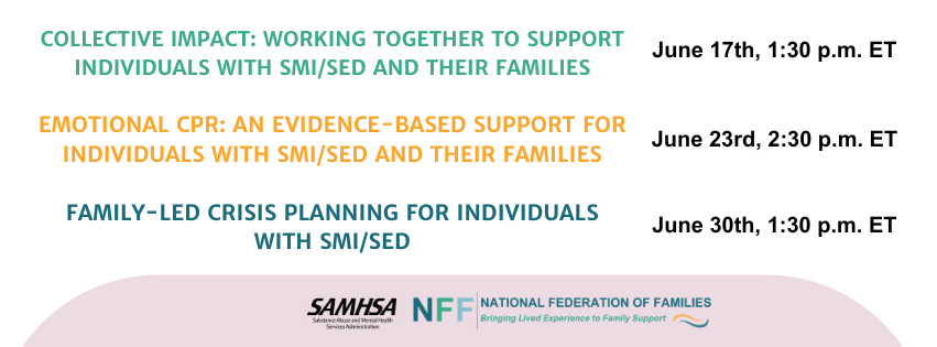 We have a very busy June planned with three great SAMHSA-sponsored webinars that introduce three related topics for individuals with SMI and SED and their families: 1) using Collective Impact to amplify our work to develop family-driven systems, 2) Emotional CPR to support our loved ones in crisis, and 3) Family-Driven Crisis Planning to prevent, address, and recover from a crisis.