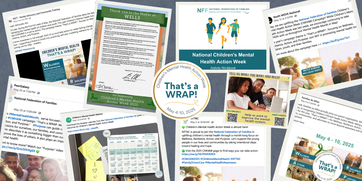 Thanks to our affiliates and partners who joined us for Children's Mental Health Action Week throughout May! "That's a WRAP!"—our 2025 campaign— started each week with very popular videos highlighting each element of WRAP: Wellness, Resilience, Action, and Purpose. In addition, we shared a full month of family-focused resources for our 15,500 social media followers that included the new #CMHAW Family Resource Calendar, our popular Family & Caregiver Toolkit, SAMHSA's Guide to Wellness, and our motivational "That's a WRAP" infographic.