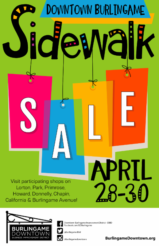 Downtown Burlingame's Bi-Annual Sidewalk Sale will be happening Friday, April 28 through Sunday, April 30 in downtown Burlingame. Along with deals all over, there will also be free face painting and a balloon artist from 11:00 a.m. to 2:00 p.m. on Saturday and Sunday! #shopliveplayBG