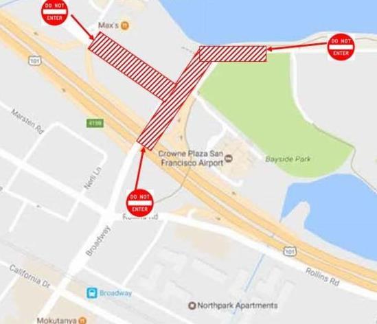 Starting at 8:00 p.m., the Broadway Overcrossing (between Rollins Road and Old Bayshore Highway) will be closed until 10:00 a.m. Saturday morning. During this closure, drivers are encouraged to use alternate routes. Electronic boards and signs will be placed to notify drivers of the changed roadway conditions. Access to the hotels will be via Millbrae Avenue or Peninsula Avenue. This work is weather dependent. Access to the Crowne Plaza Hotel will remain unchanged.