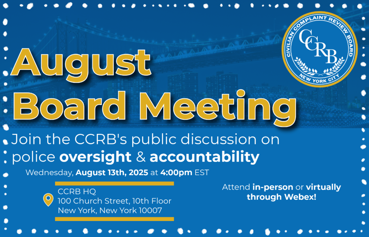 If you have requests regarding accessibility or need language interpretation assistance, please email accessibility@ccrb.nyc.gov. Requests must be received by Wednesday, August 6th, 2025.