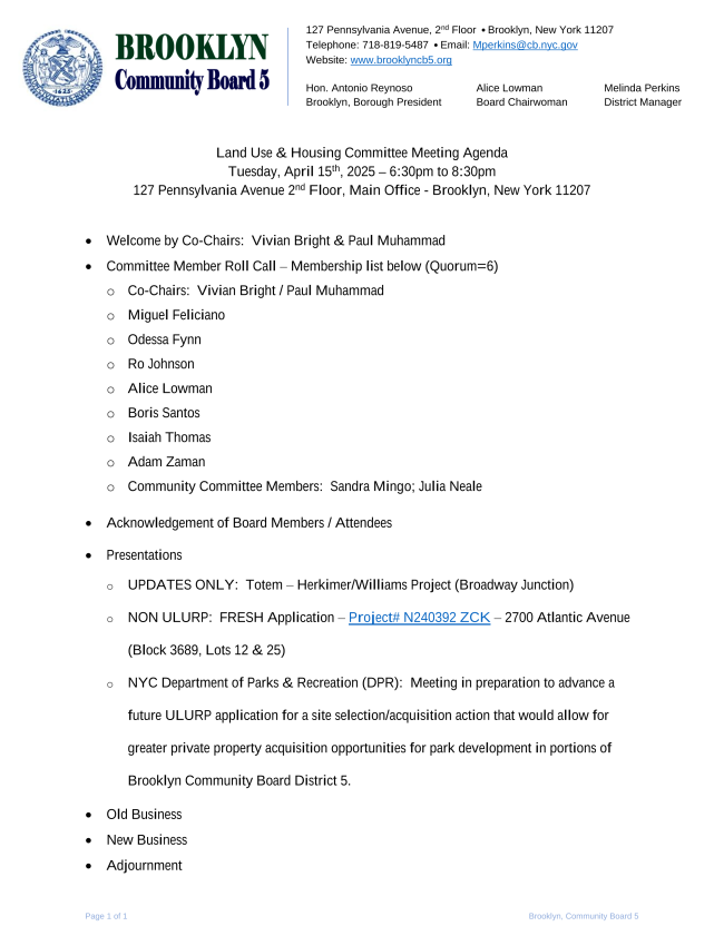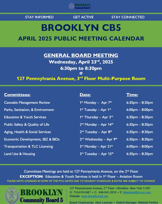 Brooklyn, Community Board 5 | 127 Pennsylvania Avenue 2nd Floor | Brooklyn, NY 11207 US