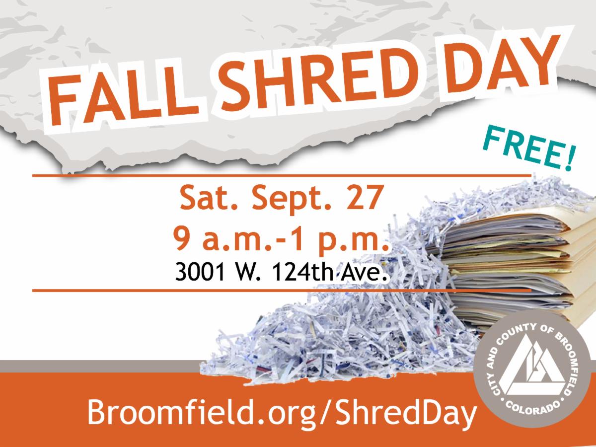 Protect your identity while securely destroying your confidential items, such as tax, medical and bank documents, for free at the Fall Shred-It event. Broomfield residents can shred a maximum of three banker’s boxes of paperwork at the Shred-It event Saturday, Sept. 27, from 9 a.m. to 1 p.m. at the Norman Smith Service Center. Shred-It will also take up to three 32-gallon trash bags of already shredded paper. No appointment is required.