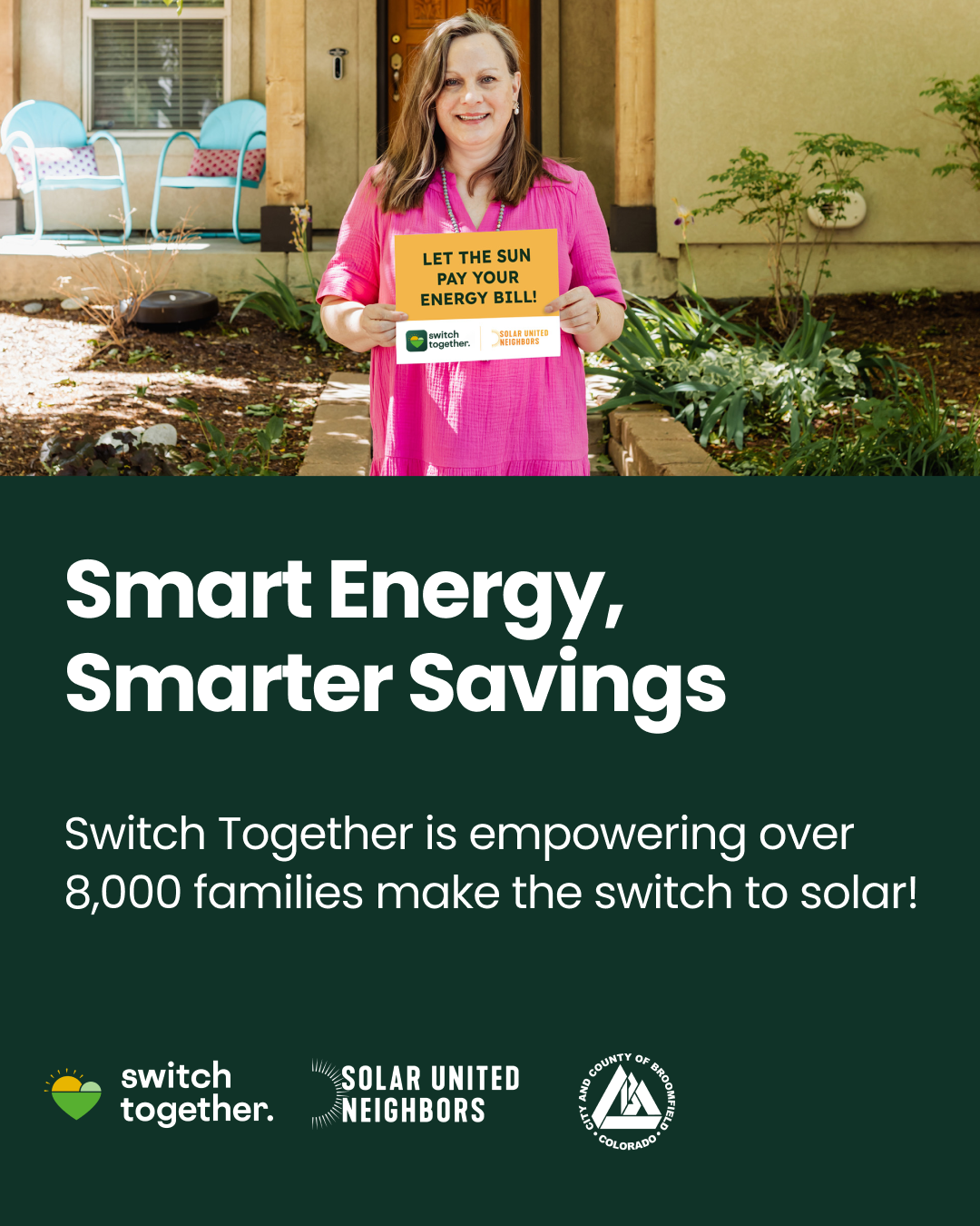 Have you ever considered solar power for your home? Save money and create a more sustainable Broomfield by going solar! CCOB is continuing to partner with Solar United Neighbors (SUN) to bring you “Switch Together Broomfield,” a follow-up to the previous solar co-op hosted by CCOB in collaboration with SUN. This program allows more residents and small businesses to participate and ensures quality solar installation. For more information about going solar, joining Switch Together Broomfield and CCOB’s partnership with SUN, visit Broomfield.org/BroomfieldSwitchTogether. Sign up to receive your no-obligation, personal recommendation by June 16.