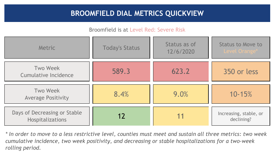 Learn more about restrictions, Broomfield’s current level on the State Dial and more at Broomfield.org/COVID.
