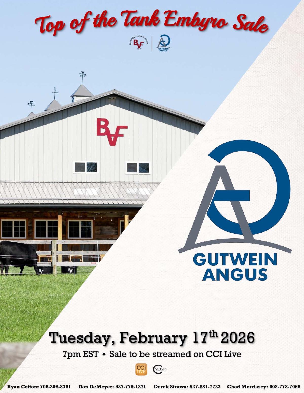Details: We're partnering with Gutwein Angus to offer 30 embryo lots, pairing elite, proven sires with our most influential Donors from our respective programs. This will be a deep, high-quality offering from top to bottom!