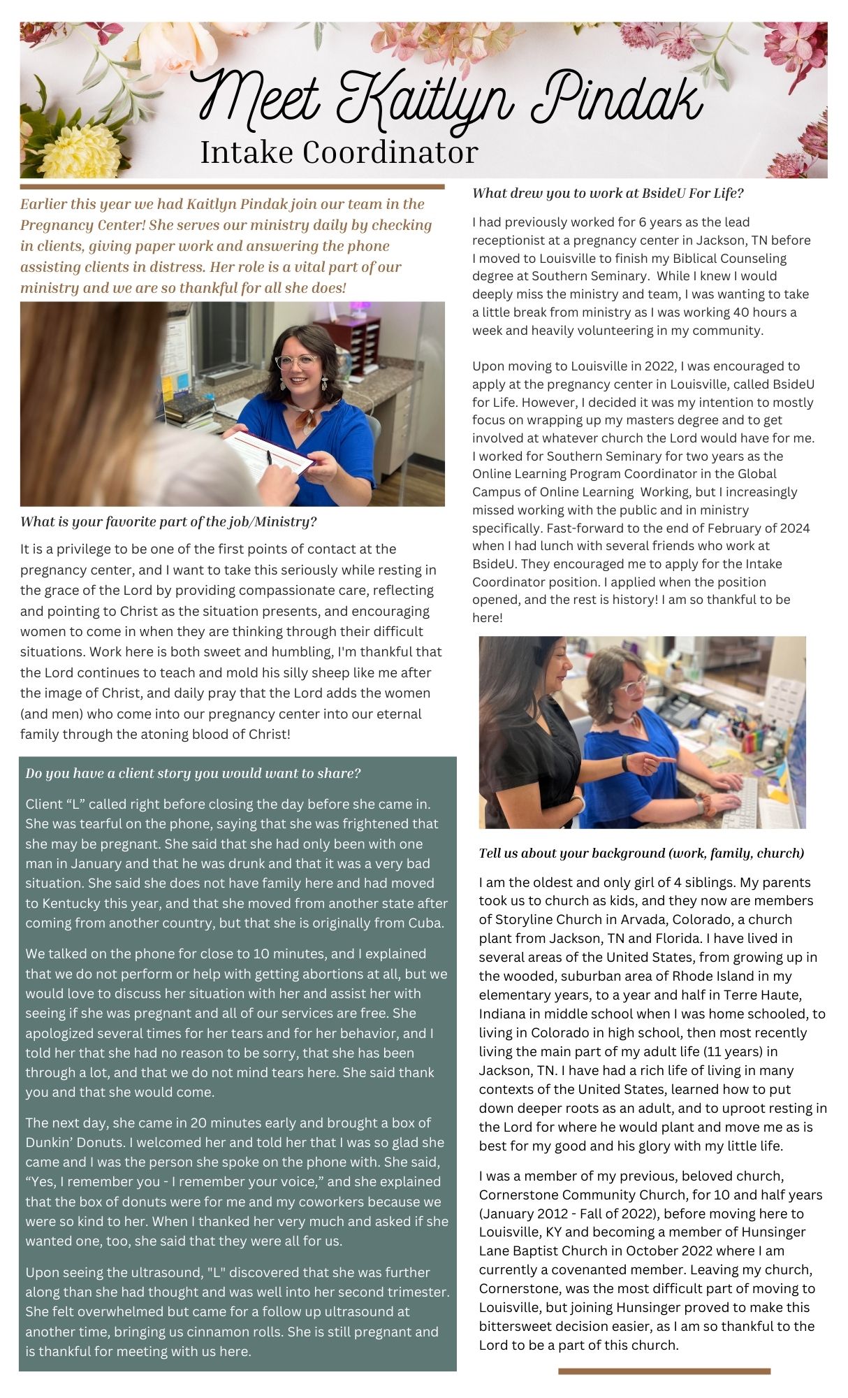 Serving on the front line of this ministry is critical for clients making appointments and making them feel comfortable immediately. Click here to meet our Intake Coordinator, Kaitlyn Pindak.