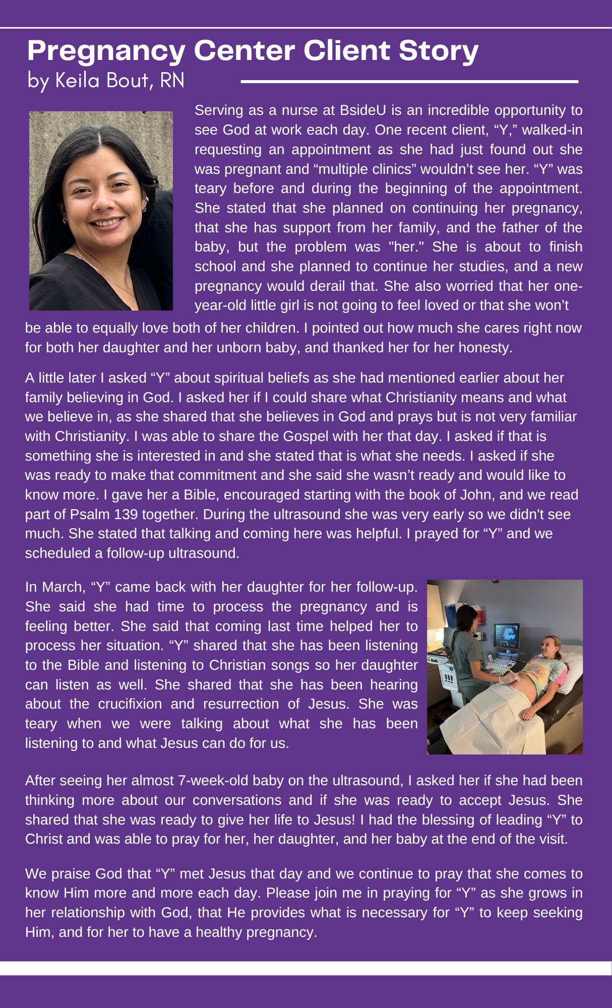 - Our nurses provide more than medical services here at BsideU. Read here how nurse Keila's care and conversation brought a mom to gospel faith.