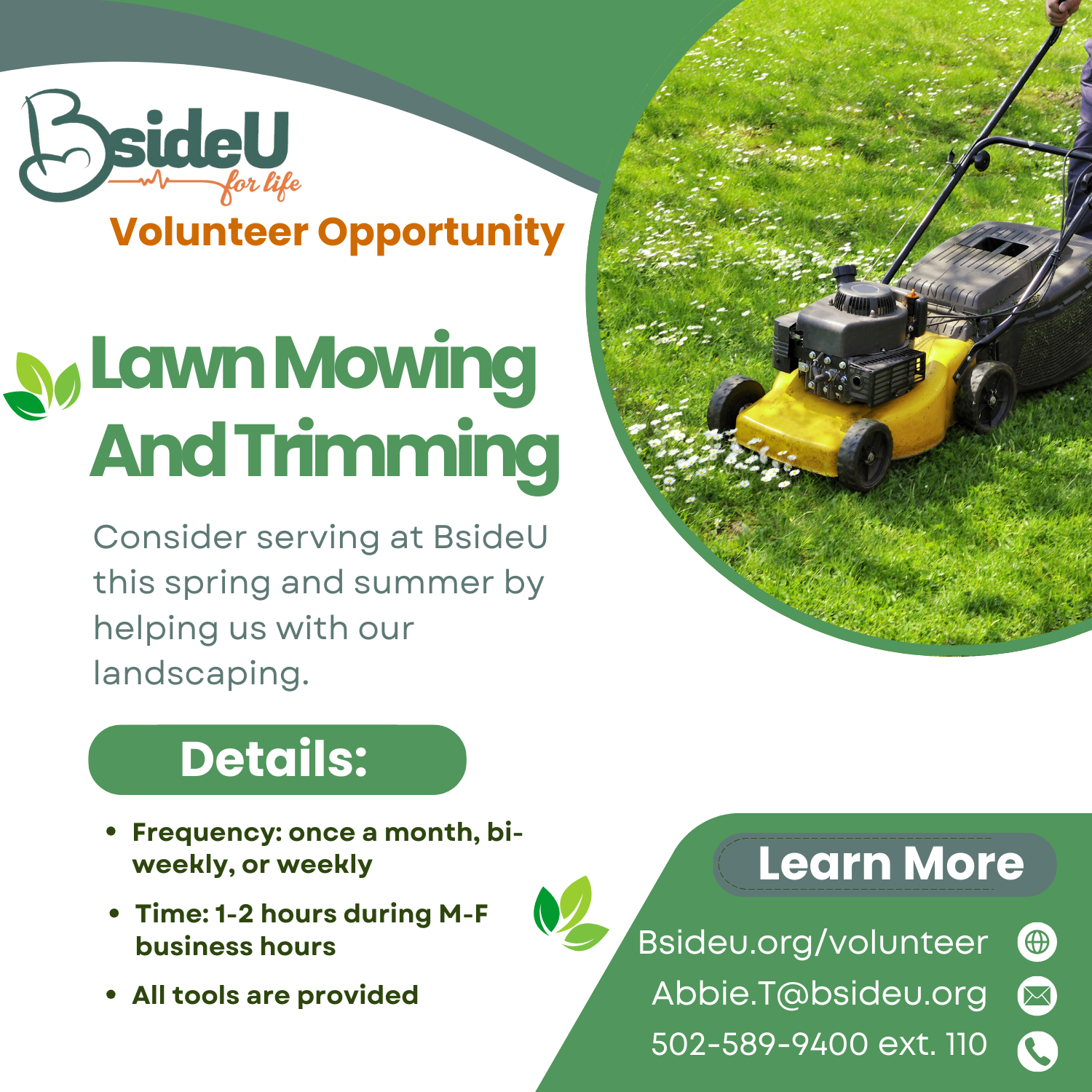 - Our lawn crew is gearing up for the summer and we are looking for folks to help maintain our small green space. Click here to find out more!