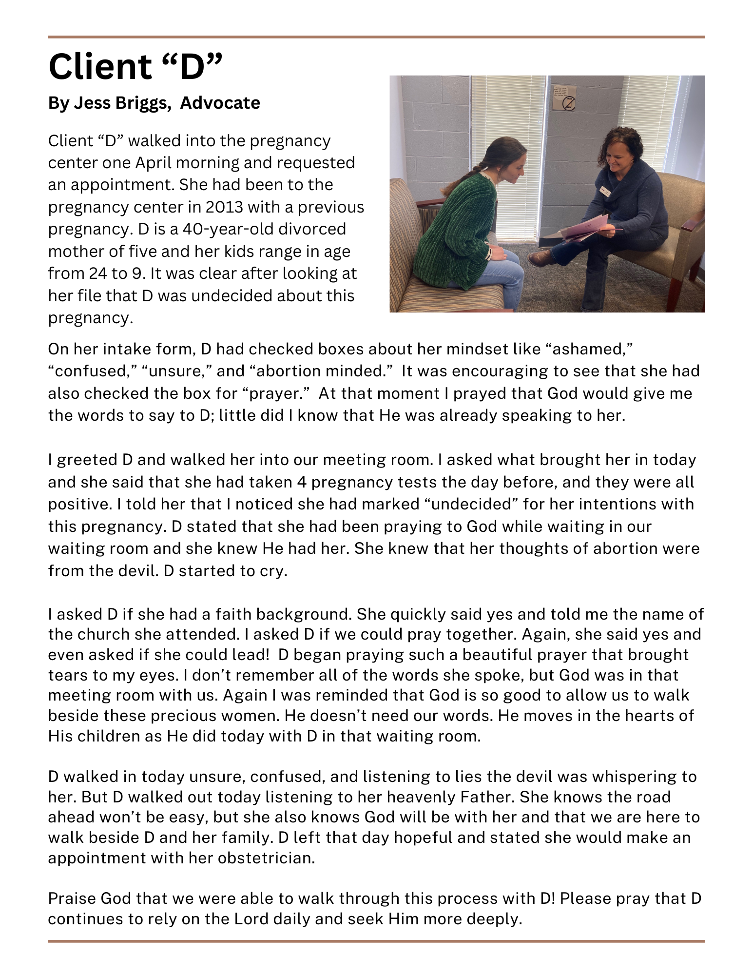 We are overwhelmed with gratitude for each of you! It's because of your faithfulness in volunteering, praying, and giving that allows us to daily serve all who come through our doors. God is faithful as well to bring us a continued increase in clients who are in need of kindness, support and guidance as they deal with the very tough life circumstances that they face. We are thankful that we get to serve each one alongside of you! Thank you for making it possible to save babies from abortion and to share the gospel with those in need here in Louisville. Here are some ministry updates: