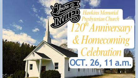 Hawkins Memorial Presbyterian Church: 120th Anniversary & Homecoming Celebration October 26 | Join the celebration on October 26, 11 a.m. at Hawkins Memorial Presbyterian Church (7816 White Oak Rd., Ford, VA) as they commemorate their 120th year with homecoming festivities and dinner on the grounds! Please RSVP by Oct. 12 by clicking below. | | |