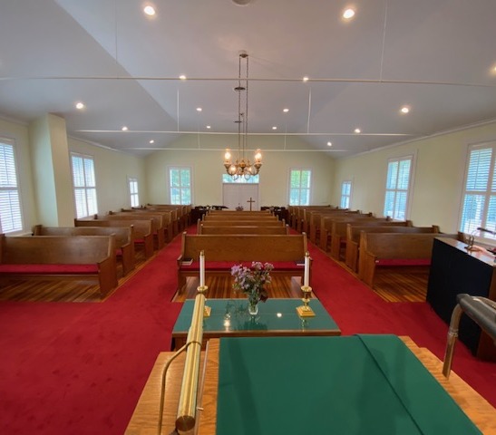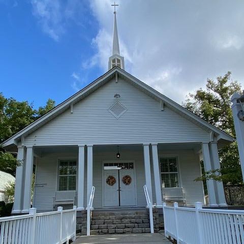 King’s Chapel is that idyllic “country church” building we all think of! White siding, a tall steeple, gravel driveway, stone steps, white fence, covered porches, and trees galore. To one side, a cemetery overlooks a field and a farmhouse in the distance; on the other side, the fellowship hall.
