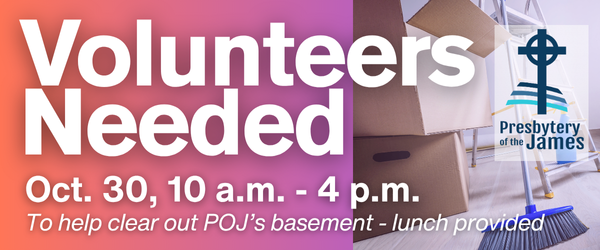 | | The Presbytery of the James is seeking several willing volunteers to assist with a much-needed basement cleaning project. Lunch will be provided. Please sign up below. | | |