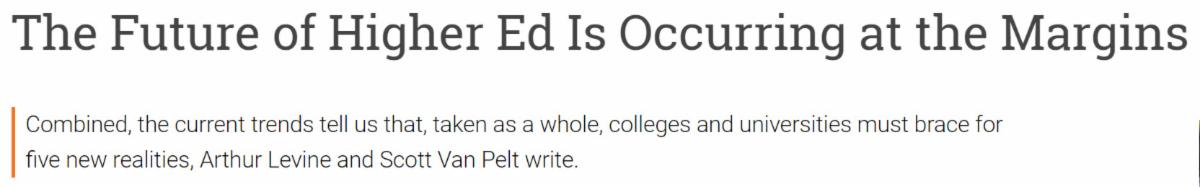 Even before the pandemic, the higher education landscape was rapidly shifting. This article, Higher Education Should Prepare for Five New Realities, written by The Great Upheaval authors Arthur Levine and Scott Van Pelt outlines the changes faced by colleges and universities as "They point to a future that is outcome-based, time-independent, digital, individualized, low-cost, and available any time and any place."
