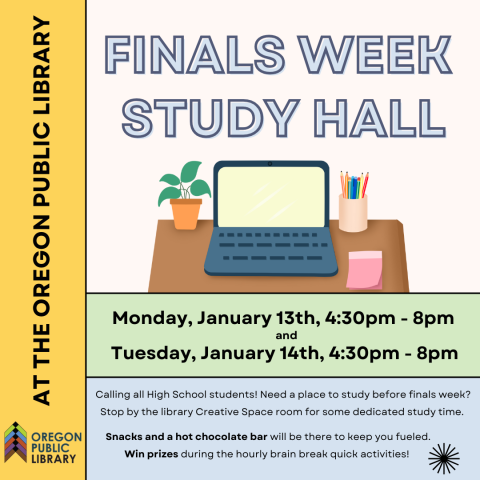 Calling all High School students! Need a place to study before finals week? Stop by the library Creative Space room for some dedicated study time. Drop in anytime between 4:30pm-8pm and stay for however long you need.