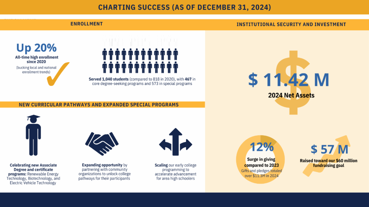In a time of new beginnings, it has been a pleasure to reflect on the accomplishments of the last calendar year. In that spirit, we are sharing our 2024 Impact Report in this issue of The Spark. This report chronicles important milestones we are meeting and exceeding as we build momentum toward laying claim to our new campus. There are many highlights of our impact, such as enrollment being at an all-time high, waiting lists for our programs, launching new associate degree and certificate programs, expanding our early college program into more schools, and launching a world-class co-op program.