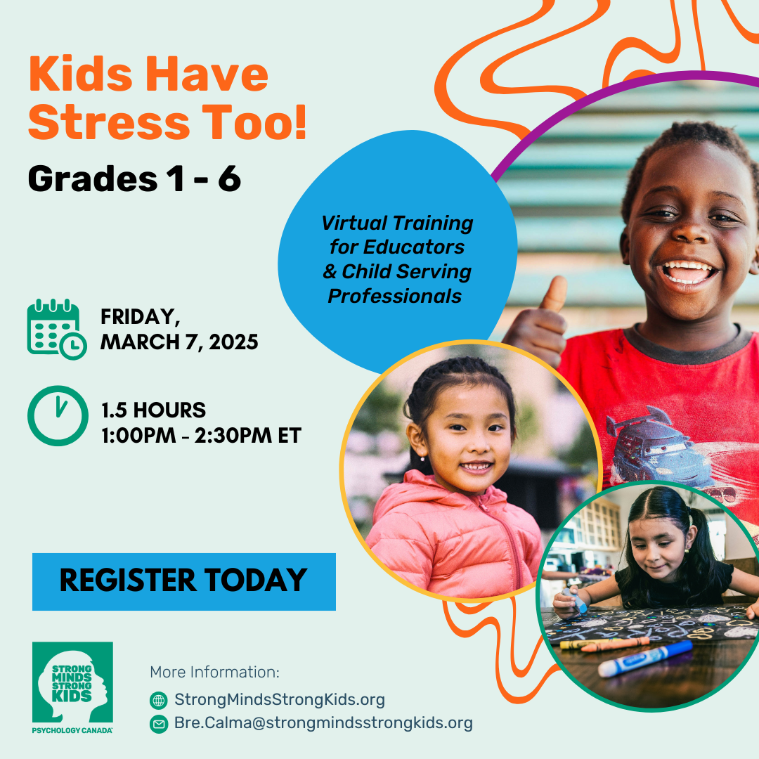 Join us for a FREE Open Call Kids Have Stress Too! Grades 1-6 training on March 7, 2025 from 1:00pm - 2:30pm ET.