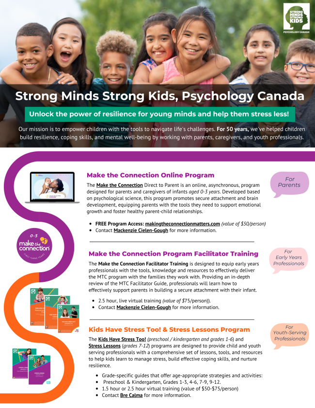 In honor of Psychology Month, we’re proud to highlight the important work we do at Strong Minds Strong Kids, Psychology Canada (SMSKPC) to support children and youth mental well-being. | | |