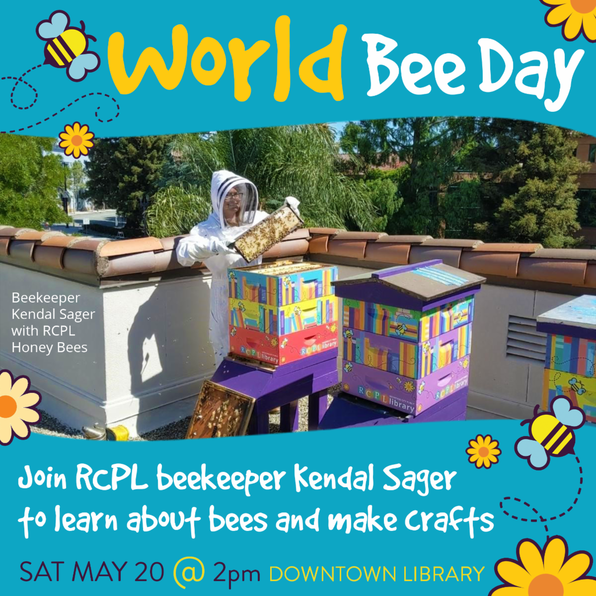 World Bee Day is Saturday! Our master beekeeper, Kendal Sager, cares for the RCPL honey bees on the Library's rooftop. She invites kids and families to celebrate with her this Saturday, May 20 at 2pm at the Downtown Library.