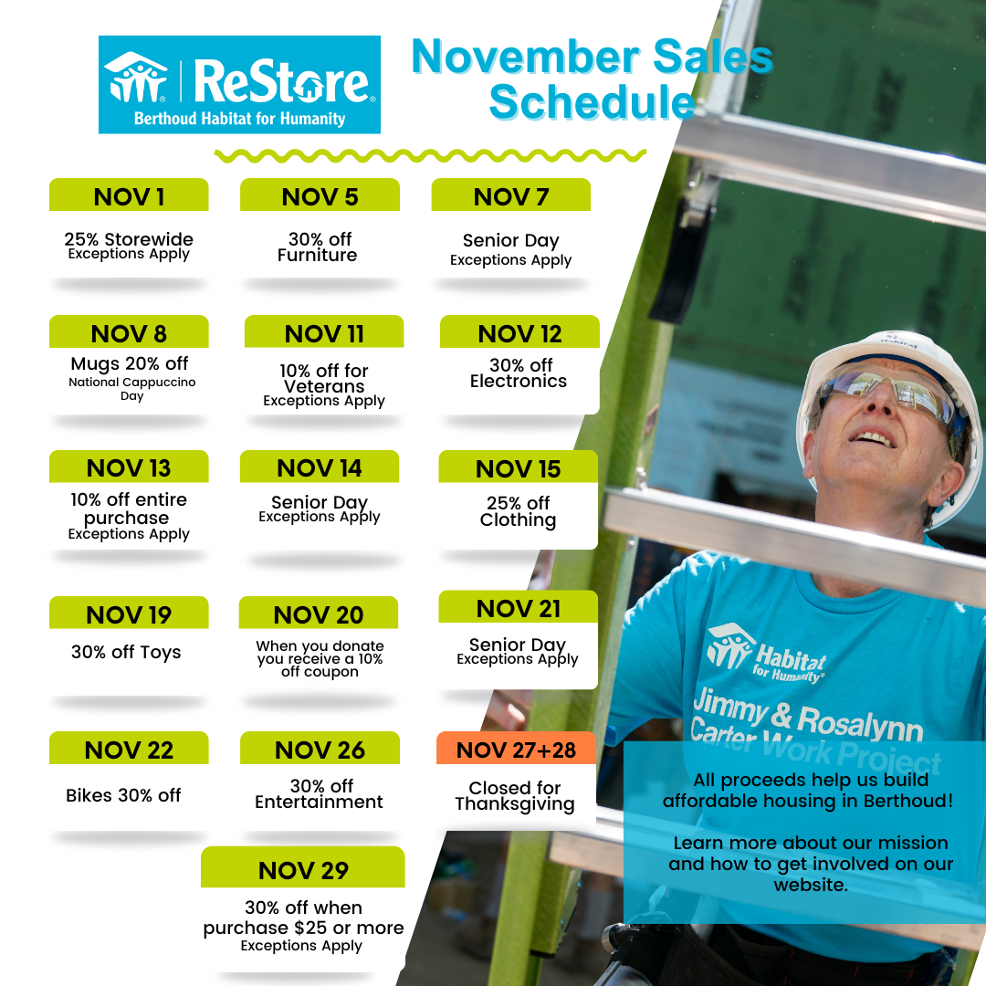 | | The holidays have arrived at the Berthoud Habitat ReStore! Stop by to explore our Vintage Christmas collection, featuring unique holiday décor, trees, ornaments, and one-of-a-kind treasures perfect for adding charm to your home this season — all at affordable prices that make a difference. | | The ReStore is also a great place for holiday shopping — find meaningful gifts, furniture, tools, and décor that give back. Shopping with us keeps usable items out of landfills, supports local families, and helps build strength and stability through affordable housing. | | As you prepare for the holidays, consider donating your gently used clothing and household items to the ReStore. Every donation fuels Habitat’s mission to build affordable homes right here in Berthoud — turning your closet clean-out into community impact. Clothing donations are especially appreciated this time of year! | | Please note: the ReStore will be closed on November 27 and 28 for the Thanksgiving holiday. We’re grateful for your continued support — thank you for helping us build homes, communities, and hope this holiday season. | |